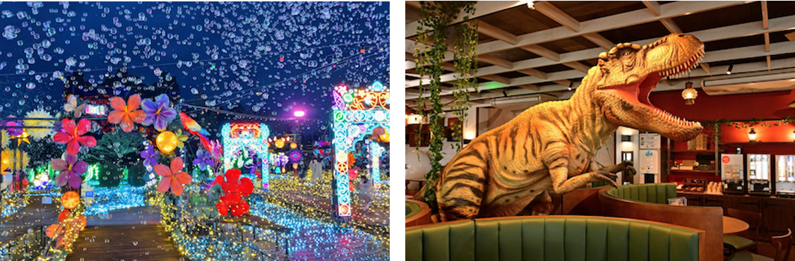イルミネーションの上を滑空する「ジップライン~流星RYUSEI~」をはじめ、ライトアップされた迫力ある恐竜たちのエリアをゴーカートで駆け抜ける「ディノエイジカート」、昭和レトロな「メリーゴーランド」などナイトアトラクションが楽しめます。